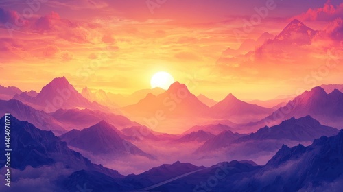 Mountain Peaks at Sunset with Colorful Sky and Fog Landscape