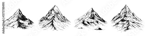 Mountain ranges depicted in detailed black and white sketches illustrating natural landscapes and rugged terrain