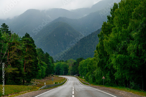 mountain road in the Caucasus to Arkhyz among the mountains in the clouds before rain