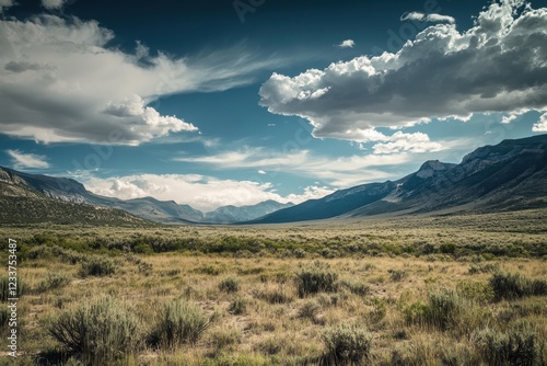 Mountain valley landscape, sunny day, clouds, travel poster