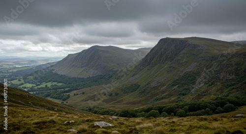 Mountain valley vista. Lush greenery, rugged peaks, dark clouds
