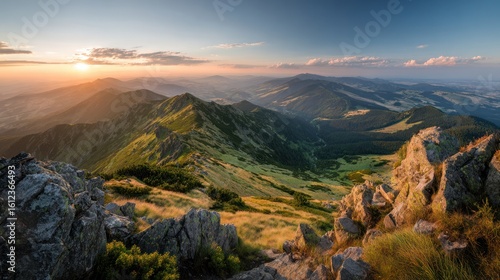 Mountain vista at sunset. Vast panorama of rugged peaks and valleys bathed in golden light. Rolling hills and forests stretch into hazy distance. Rocky outcrop foreground