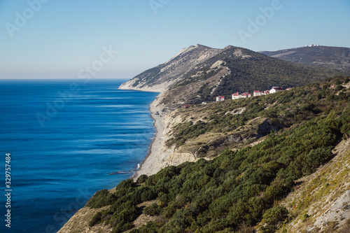 Mountainous rocky seashore covered with juniper forest in summer. A steep cape with an adjacent quiet bay and a stone beach.