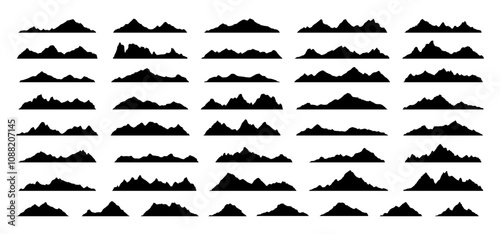 Mountains silhouettes on the white background. Rocky terrain natural landscape for scenery. Vector set of outdoor design elements. Mountains and alpine peaks.