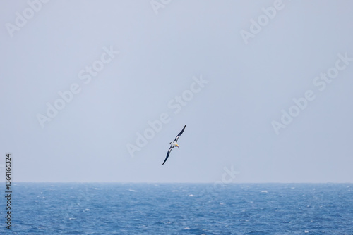 沖を飛翔する巨大なアホウドリ(アホウドリ科)。翼長は2m以上。 英名学名:Short-tailed albatross, Phoebastria albatrus 絶海の孤島である、三宅島周辺は非常に海鳥の数が多い。 東海汽船東京湾~伊豆諸島八丈島、太平洋航路の橘丸船上にて - 2025