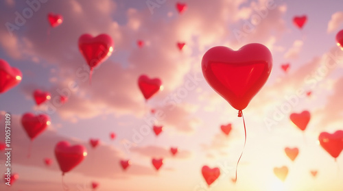 Muchos globos rojos en forma de corazones en el cielo durante un suave atardecer rosa, con fondo de San Valentín.