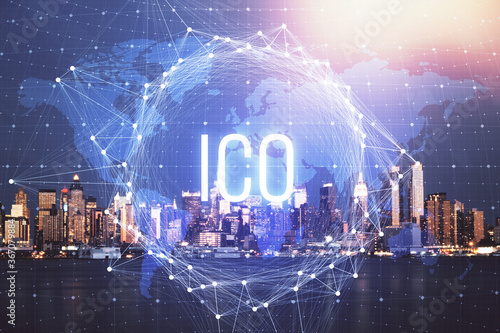 Multi exposure of cryptocurrency theme hologram drawing and city veiw background. Concept of blockchain and bitcoin.
