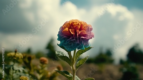 Multicolored extraterrestrial flower. View from below on flower and sky. Generative AI