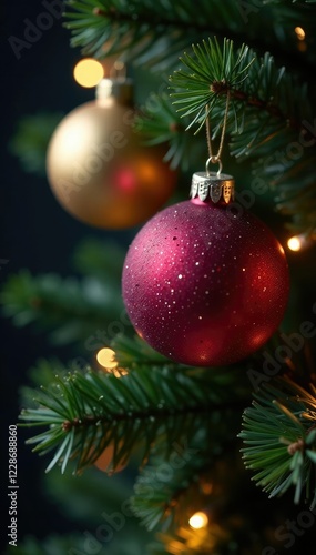 Multicolored glass ball with glitter on a lighted Christmas tree branch, holly decorations, seasonal decor