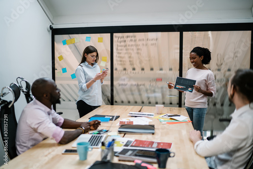 Multicultural group of creative people dressed in formal wear discussing business startup project at meeting table during brainstorming in modern office, collaborative process of financial experts