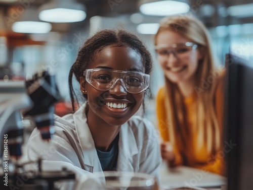 Multicultural team of scientists engaging in collaborative research in modern laboratory