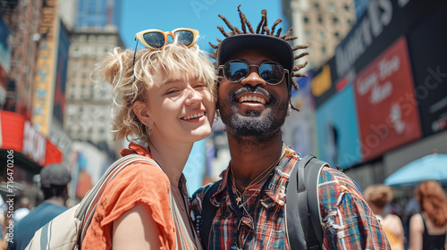 Multiethnic two friends tourists woman and black man smiling on the street,