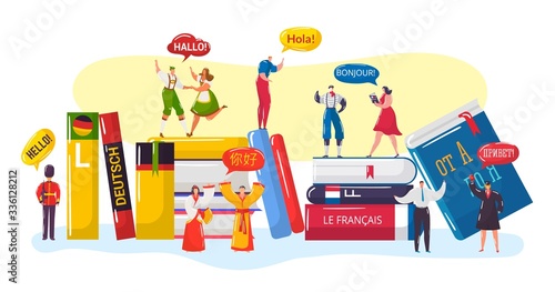 Multilingual greeting vector illustration. Cartoon flat tiny people in national traditional clothes greet and say Hello in French, Russian, English, German or Chinese language isolated on white