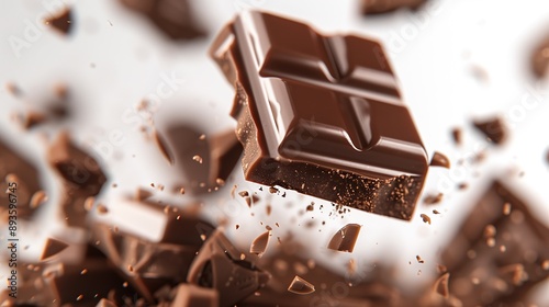 multiple chocolate bar pieces flying in air with choco pieces dust on blurred white background