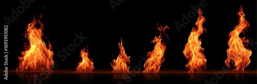 Multiple flames of varying sizes on a reflective surface against a dark background