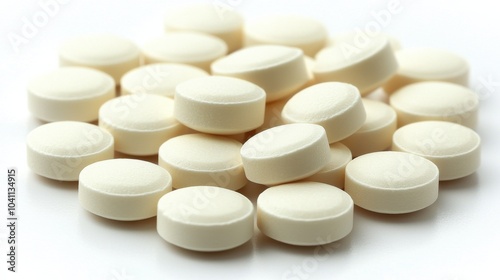 Multiple white tablets arranged closely on a smooth surface, highlighting their texture and shape under soft lighting