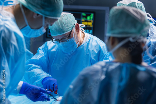 Multiracial team of professional medical surgeons performs the surgical operation in a modern hospital. Doctors are working to save the patient. Medicine, health, cardiology and transplantation.