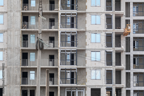 Multistory residential white brick building facade construction site, outdoor architecture details pattern