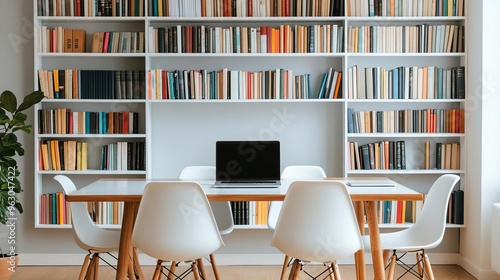 Multi-use dining area with bookshelves and a laptop station, mid-century modern style