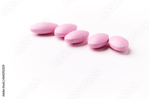 Multivitamin tablets on bright paper background. Close up. Copy space