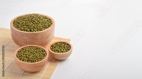 Mung beans in wooden bowls on bamboo mat background. Healthy plant based food concept with green pulses, organic legumes, and natural ingredients with copy space.