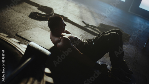 Muscular athlete performing sit-ups in dramatic gym setting