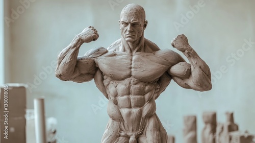 Muscular human figure sculpture showcasing intricate definition set against a soft neutral background highlighting craftsmanship and artistic skill