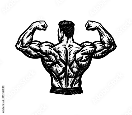 Muscular Man Showing Back Muscles and Biceps with Arms Raised in Black and White Line Art