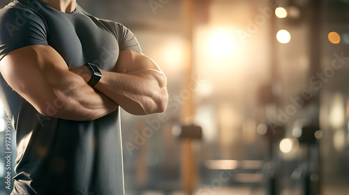 Muscular man stands with his arms crossed in a gym in the background, blurred