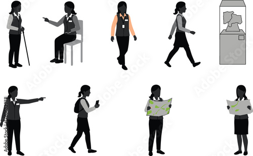 Museum visitor silhouette, exhibition activity, black vector, map reading, display interaction, walking pose, casual figure, indoor scene, public space, educational icon