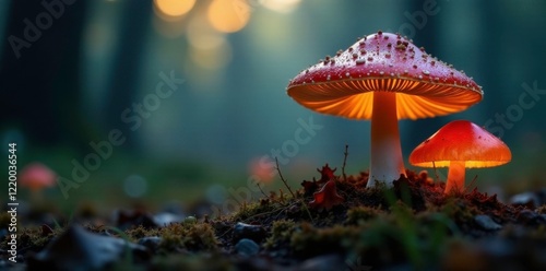 Mushroom caps glowing softly in the fading light, eerie, enchanted