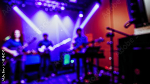 Music band group perform on a concert stage. Guitarist on stage for background, soft and blur concept. Music band performing in a recording studio.