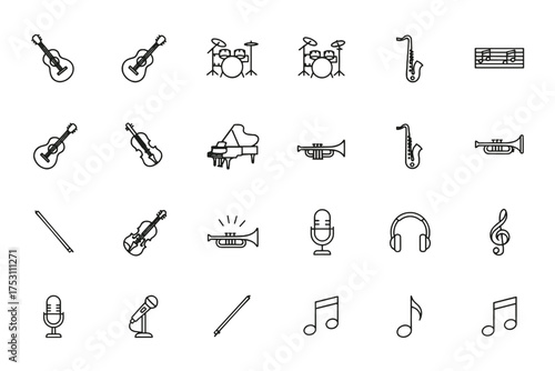 Music instrument icon set vector pack. Line icons. Guitar, drums, piano, violin, trumpet, sax, mic, headphones. Sound, audio, song, melody. Band, jazz, concert, studio.