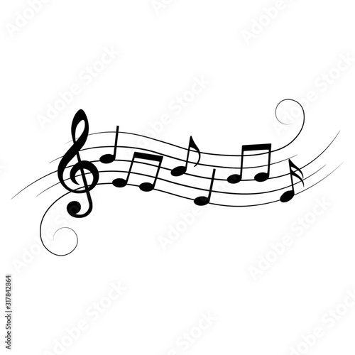 Music notes and symbols, with curves and swirls, isolated, vector illustration.