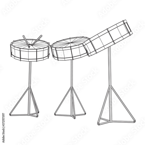 Musical instruments set. Rock band kit. Percussion musical instrument drum and stick. Wireframe low poly mesh vector illustration.