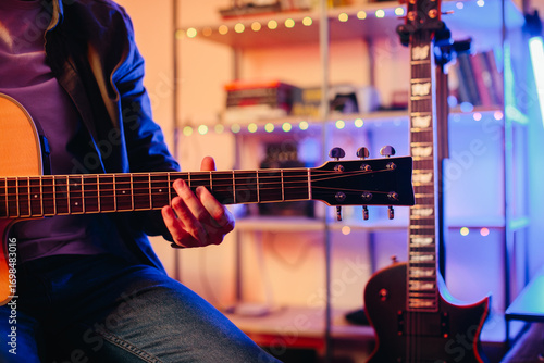 Musician playing acoustic guitar and writing music at home studio