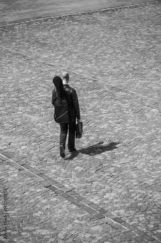 musicien traversant une place pavée avec une guitare