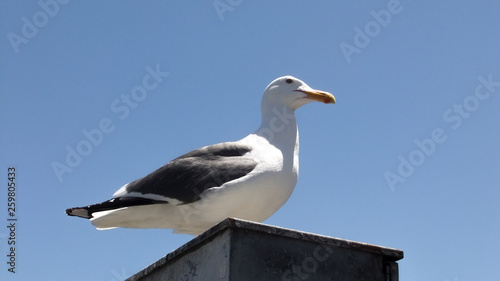 Möve auf Pfeiler vor blauem Himmel