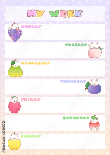 My week. Weekly planner with cute illustrations of little kittes and fruits. Kawaii school accessory. Vector 10 ESP.