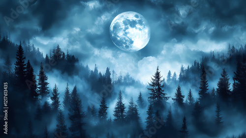 Mysterious and enchanting moonlit mountain forest landscape with dramatic cloudy sky serene atmospheric and ethereal nature scene with silhouetted trees and misty backdrop. Moonlit Ridge. Illustration