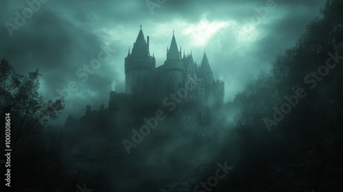 Mysterious Castle in Foggy Forest