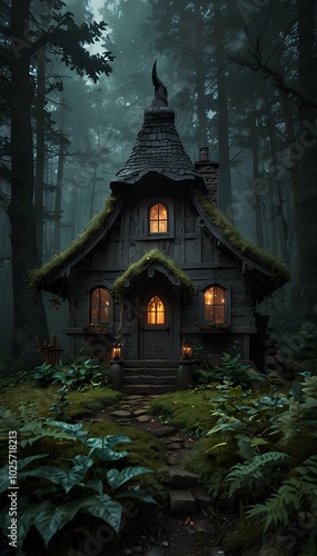 Mysterious Crooked Cottage in Dark Forest with Misty Atmosphere and Magical Glow