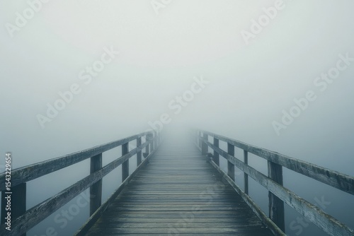 Mysterious foggy pier disappearing into the mist tranquil coastal setting serene nature scene wide-angle view concept of isolation