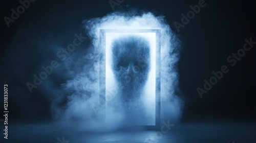 Mysterious glowing doorway surrounded eerie smoke in dark atmosphere