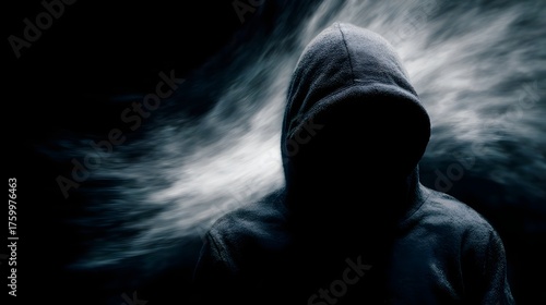 Mysterious hooded figure in a dramatic smoky dark atmosphere