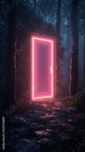 Mysterious Neon Doorway in Enchanted Forest at Twilight