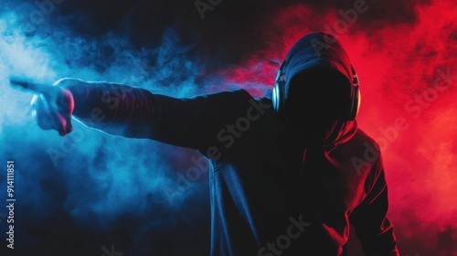 Mysterious Young Man in Hoodie with Headphones Pointing in Colorful Smoke Background for Music and Entertainment Marketing