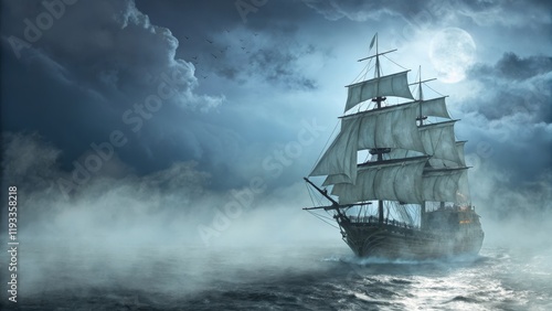 Mystic Galleon Digital Painting of a Sailing Ship at Night, Fantasy Seascape, Moonlit Ocean Keywords Digital Art, Fantasy