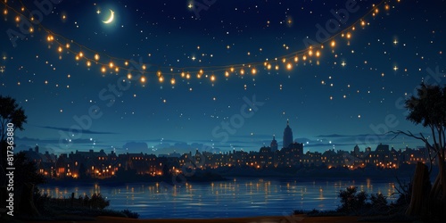 Mystic Night Sky Over Riverside Cityscape Illuminated by String Lights with Crescent Moon in a Serene and Peaceful Evening Scene