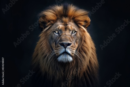 Mystic portrait of African Lion, beside view, full body shot, Close-up View Isolated on black background